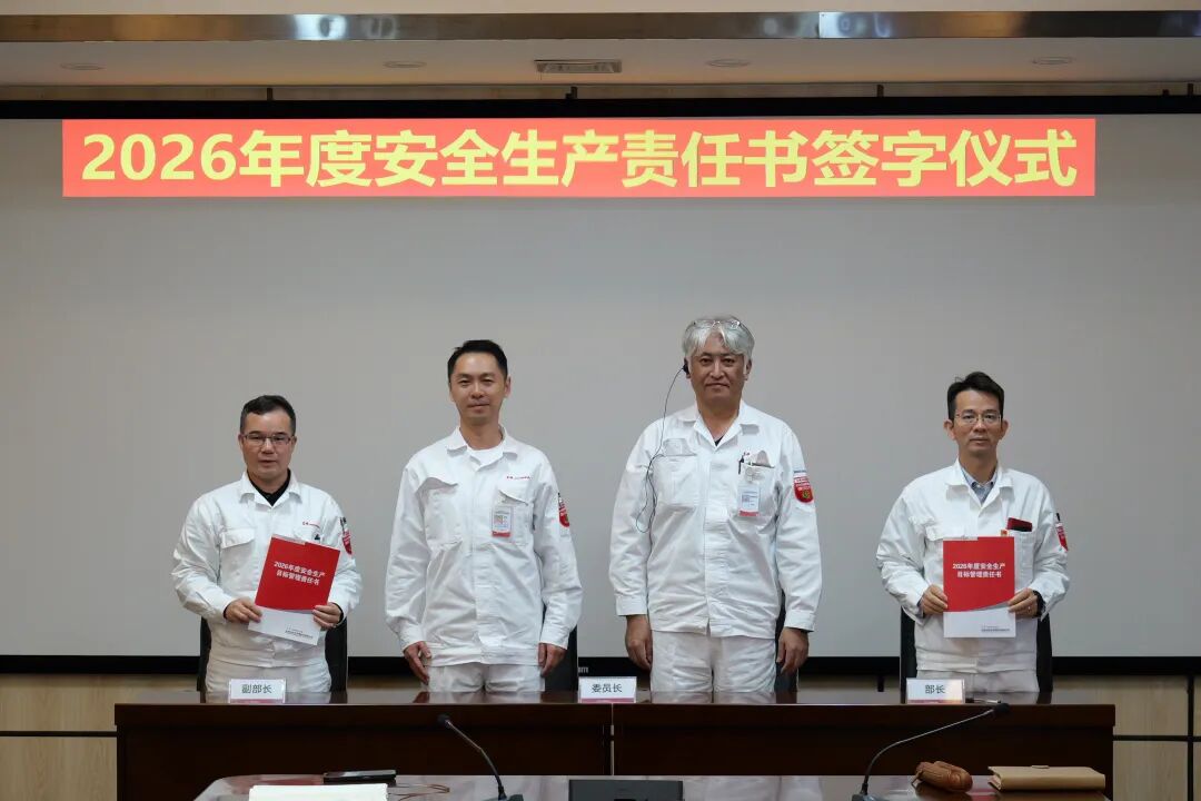1月16日上午,公司安全生产与环保低碳管理评审会暨2026年度安全生产责任书签订仪式在综合楼举行。公司总经理、安委会委员长樋熊敏郎,副总经理、党委书记、安委会委员长陈石,各部门安全责任人、科长以上管理者及安环担当等50余人参加会议。会议系统复盘了2025年度安全、环保、能源管理工作,并确定2026年度重点课题。陈石强调要强化数字化系统应用,全面提升安全管理能力;樋熊敏郎要求深挖重复性隐患根源,切实落实整改,坚决遏制问题复发。
