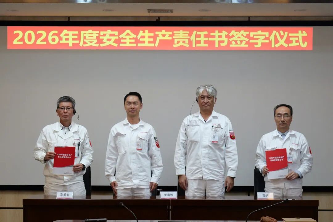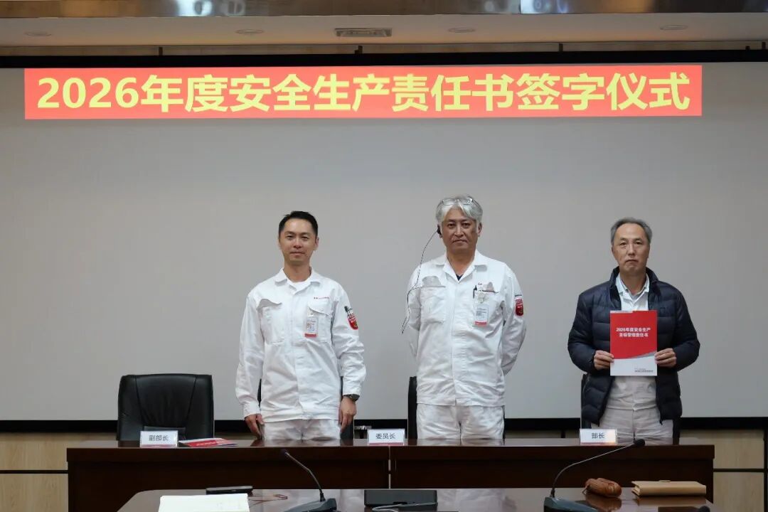 1月16日上午,公司安全生产与环保低碳管理评审会暨2026年度安全生产责任书签订仪式在综合楼举行。公司总经理、安委会委员长樋熊敏郎,副总经理、党委书记、安委会委员长陈石,各部门安全责任人、科长以上管理者及安环担当等50余人参加会议。会议系统复盘了2025年度安全、环保、能源管理工作,并确定2026年度重点课题。陈石强调要强化数字化系统应用,全面提升安全管理能力;樋熊敏郎要求深挖重复性隐患根源,切实落实整改,坚决遏制问题复发。
